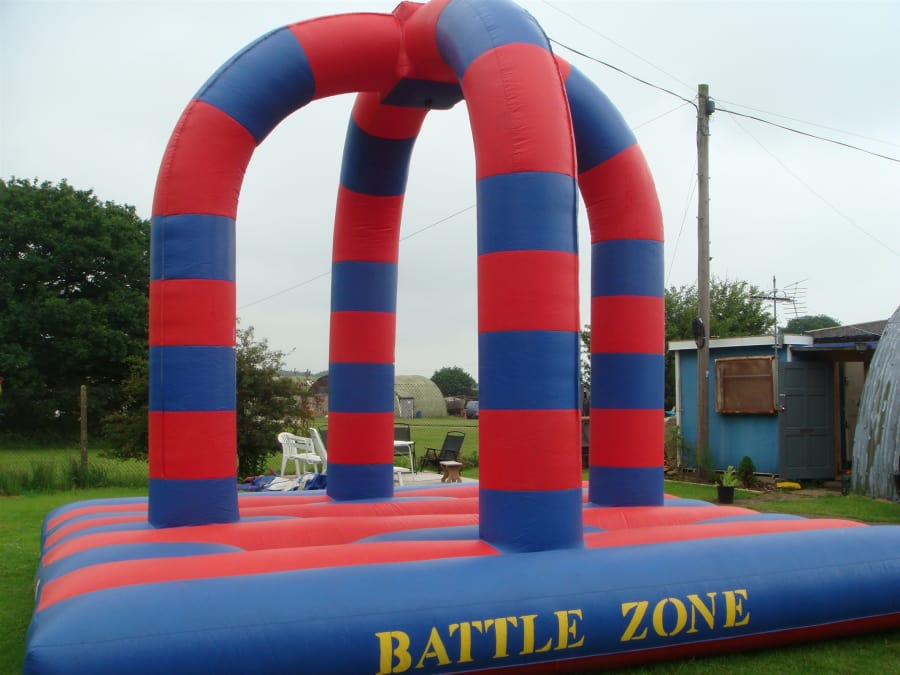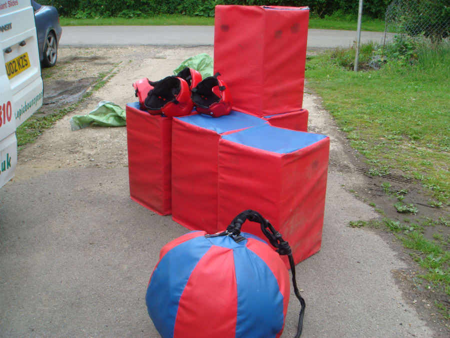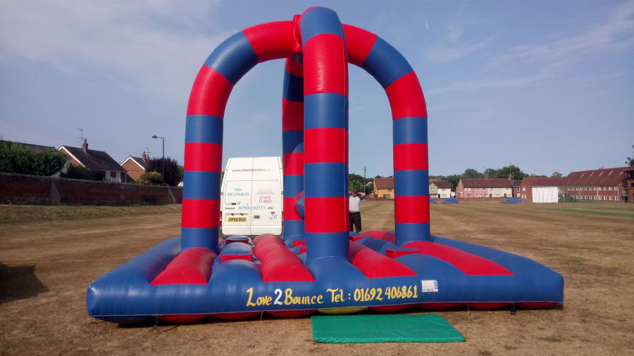 This activity is great fun for all events. It is 18 ft x 18 ft Archs are blue and red strips and a nice blue and red bed. Stands are foam and slot into holes in bed. Comes fully erected with blower, mats where needed and pegs or sand bags and ready to use. . There are six stands,The Ball hangs from the middle and the idea is to knock each other off the stands the ball is not for sitting on and swing with as could pull off the top .