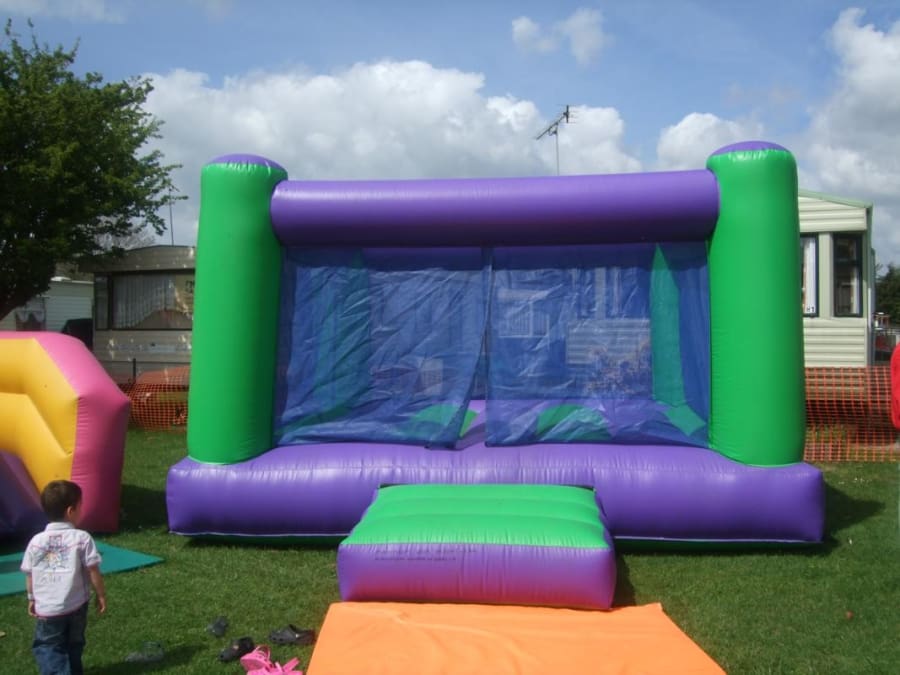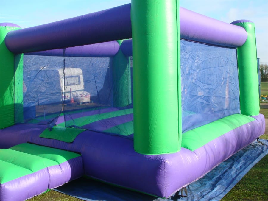 Great fun for everyone. Comes with blower, mats,extension lead and pegs or sand bags and is fully erected for you and ready to use. Ring is a lovely purple and green in colour.