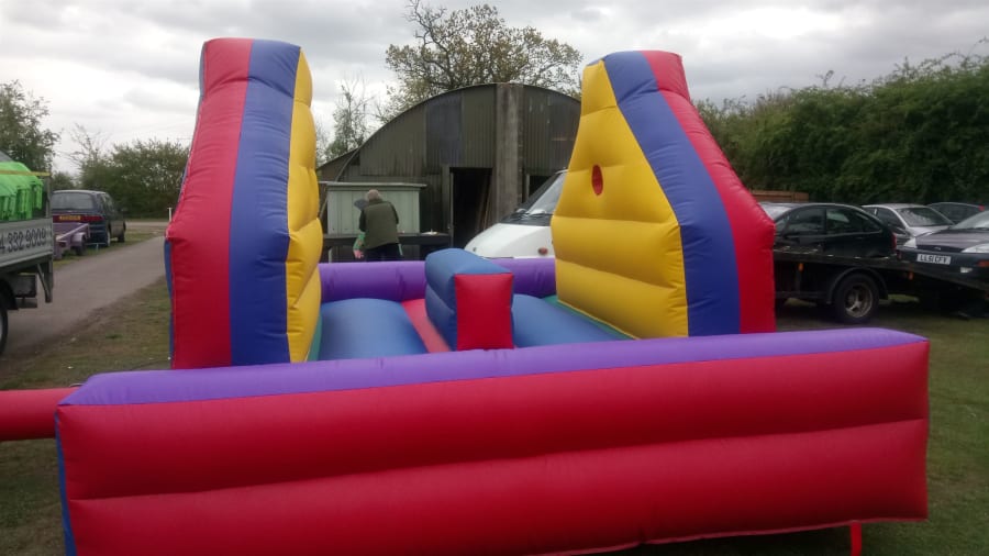 12 ft x 14 ft. Great fun for all age's. If you can't get a Gladiator in your garden a Pole joust will fit. Ideal for corporate events , fun days' and all events. See how long it takes to send your opponent crashing to the bed. Very colourful activity with red and yellow walls , blue and green bed and plum sides. Comes pegged down with blower and mats and ready to use.
