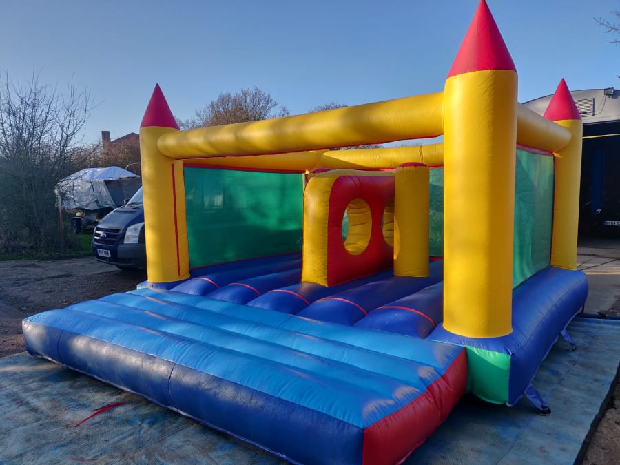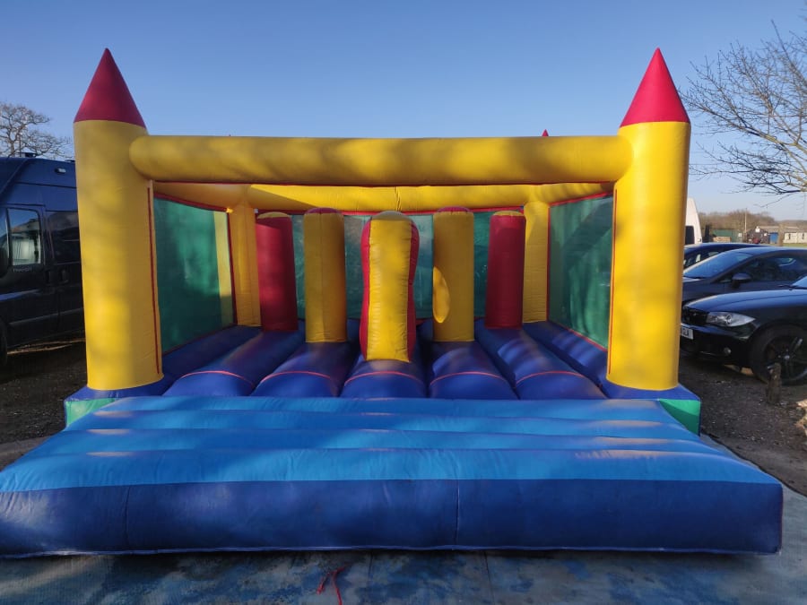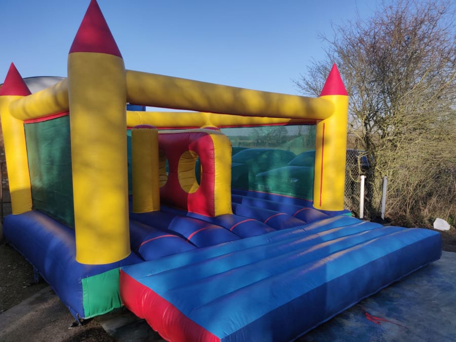 FOR INDOOR USE ONLY. Tots castle with bashers and a climb through wall inside , great fun for the kids. castle is 14 ft x 14 ft and you can see right through the netting and watch the kids play. Castle comes fully erected with blower, mats, stakes or sand bagged down and ready for you to use. Children to the age's of 10years.